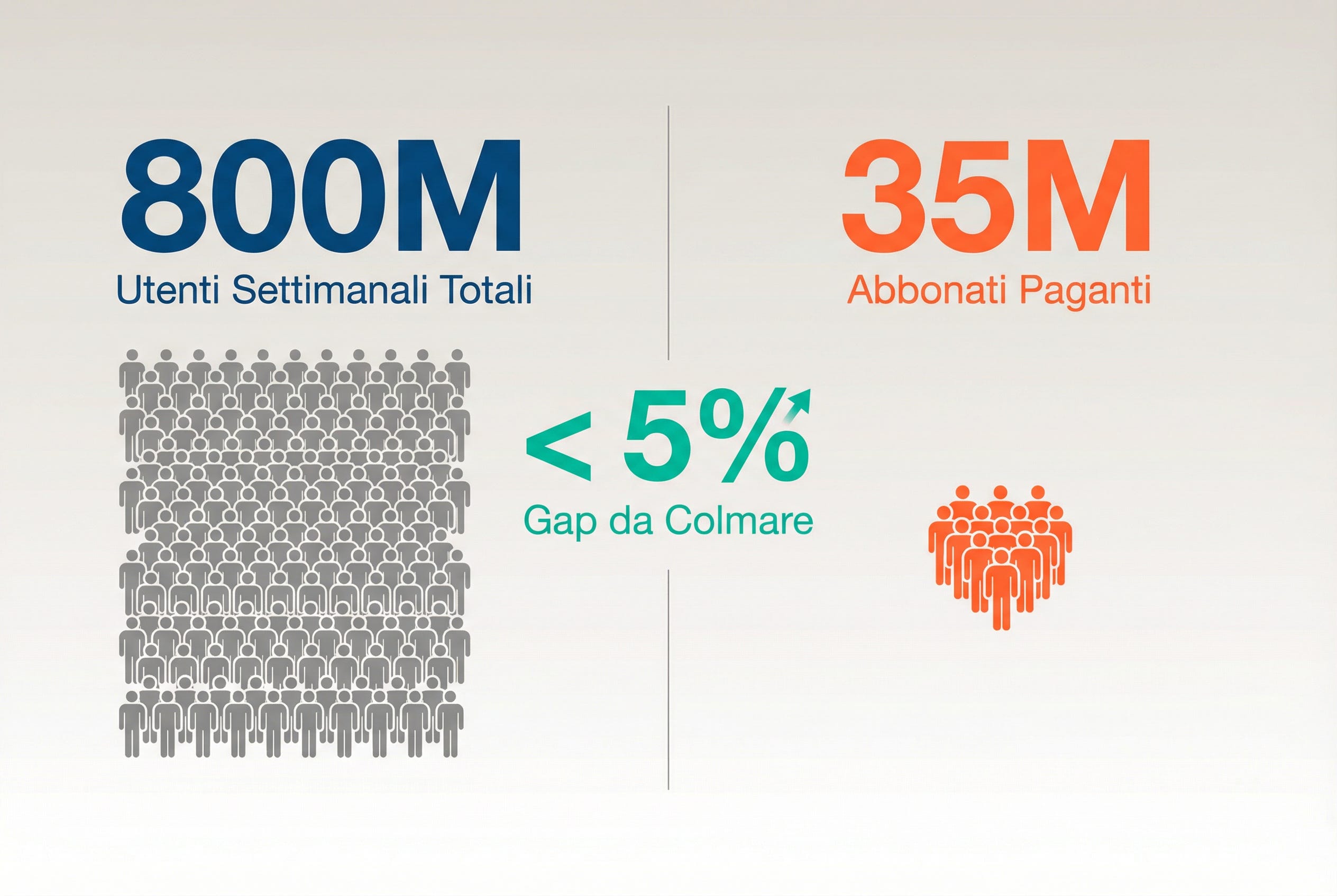 Se manteniamo l’attuale base di 800 milioni di utenti settimanali (scenario conservativo), questo significherebbe convertire circa il 27-28% degli utenti in paganti.