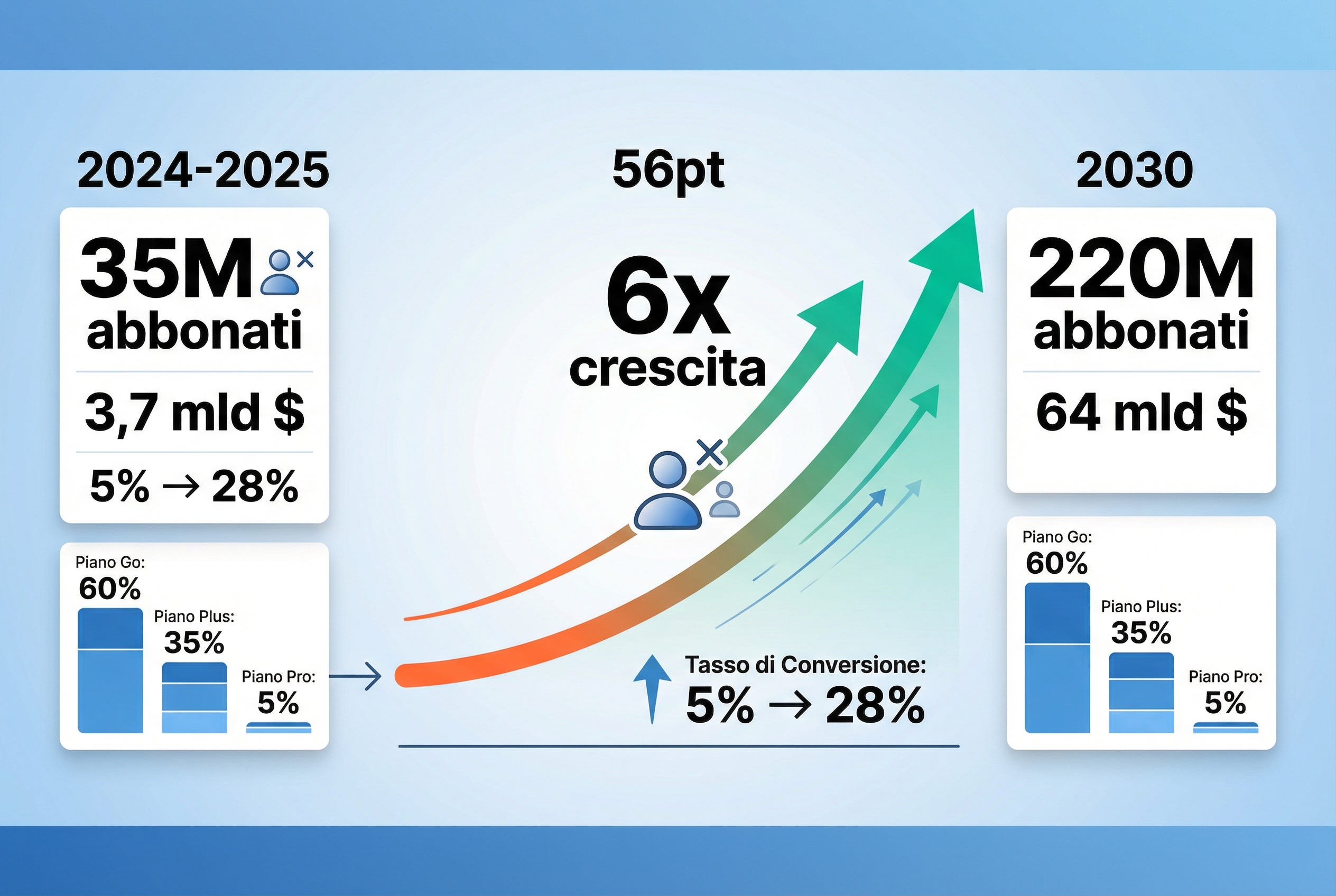L’Obiettivo 2030 OpenAI ha dichiarato l’intenzione di raggiungere 220 milioni di abbonati paganti entro il 2030. Facciamo due conti: