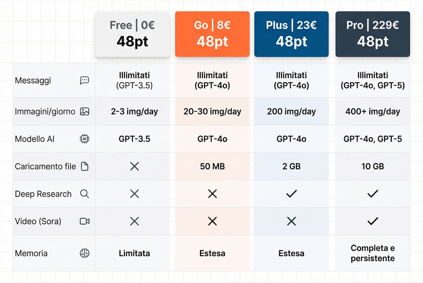Per noi creator e professionisti, Plus rimane la scelta migliore: 50 immagini ogni 3 ore, Deep Research completo, e accesso a Sora sono differenzianti. Ma per la massa? Go è perfetto.